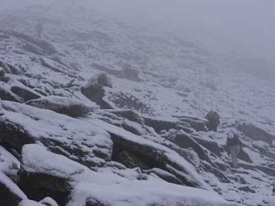 Lamentablemente el tiempo era horrible, fresquete, empezaba a nevar y con niebla... Tras esperar 1.5h a ver si aclaraba un poco, decidimos empezar con la ascesión... más niebla y más frío a medida que subíamos...