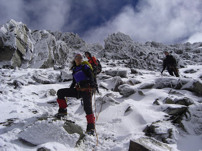 No es nada agradable tener niebla en un glaciar... blanco con blanco da como resultado no ver ni las huellas del que va delante de ti en la cordada... un horror! Ventisca, nieve, frío... pero ganas de continuar! La montaña te hace fuerte y te hace superarte a ti mismo, es una maravilla... y un vicio!! :-P Todo con sus medidas, claro!